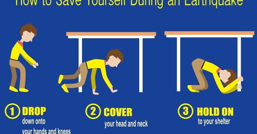 Indoors: Drop, cover, and hold on. Dot not use elevators.
