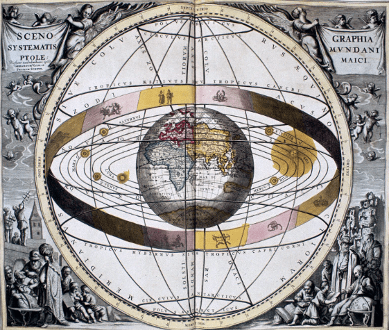This ancient image shows what people once believed long ago about the Earth's position in space. What science word does this image depict?