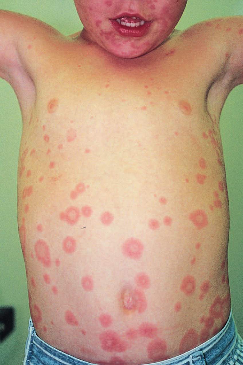 This skin condition refers to a group of hypersensitivity disorders characterized by symmetric red, patchy lesions, primarily on the arms and legs; it is associated with herpes simplex virus and in half of the cases, the triggering agents appear to be medications.