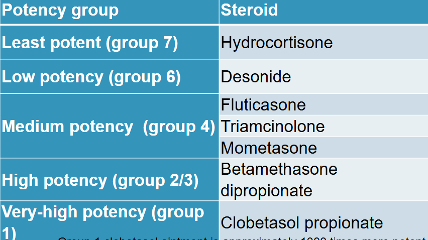 Hydrocortisone <Desonide <Fluticasone < Triamicolone <Mometasone <Betamethasone <Clobetasol