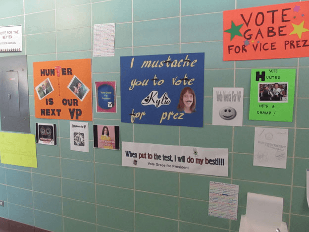 The teacher told the students to ____ ____ the posters immediately.