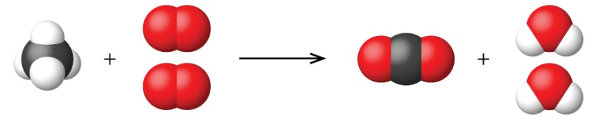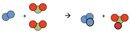 2 blue reactant atoms, 3 blue product atoms; 4 red reactant atoms, 3 red product atoms; 2 gray reactant atoms, 1 gray product atom