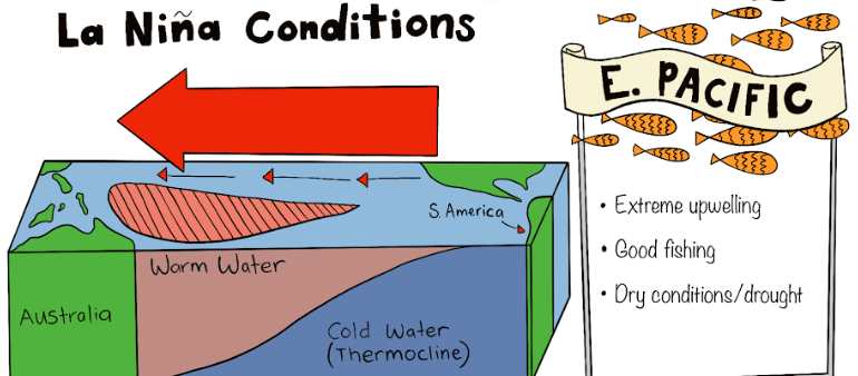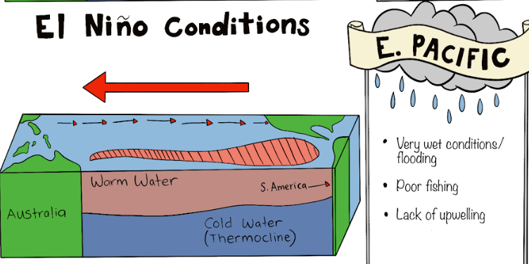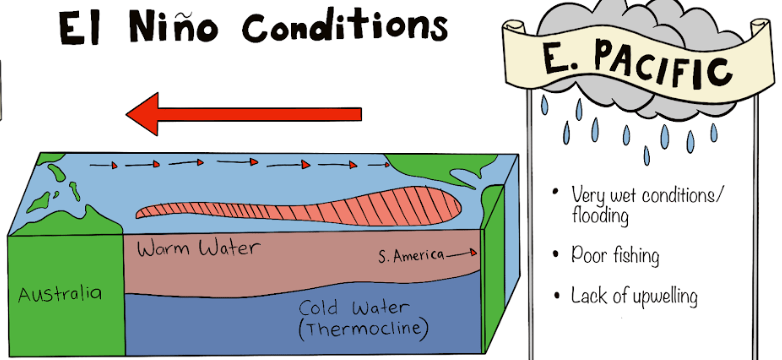 Waters are warm, wet conditions, lack of upwelling, poor fishing.