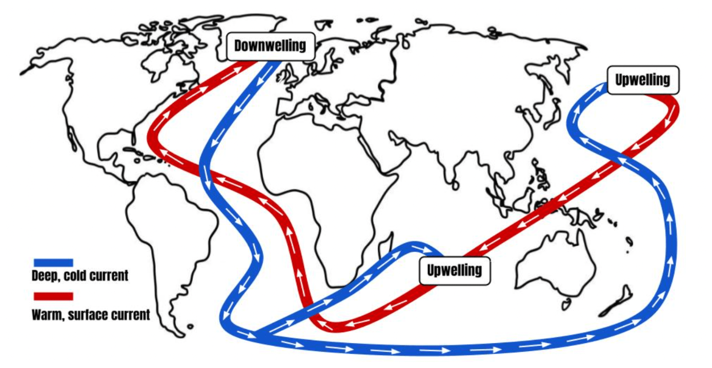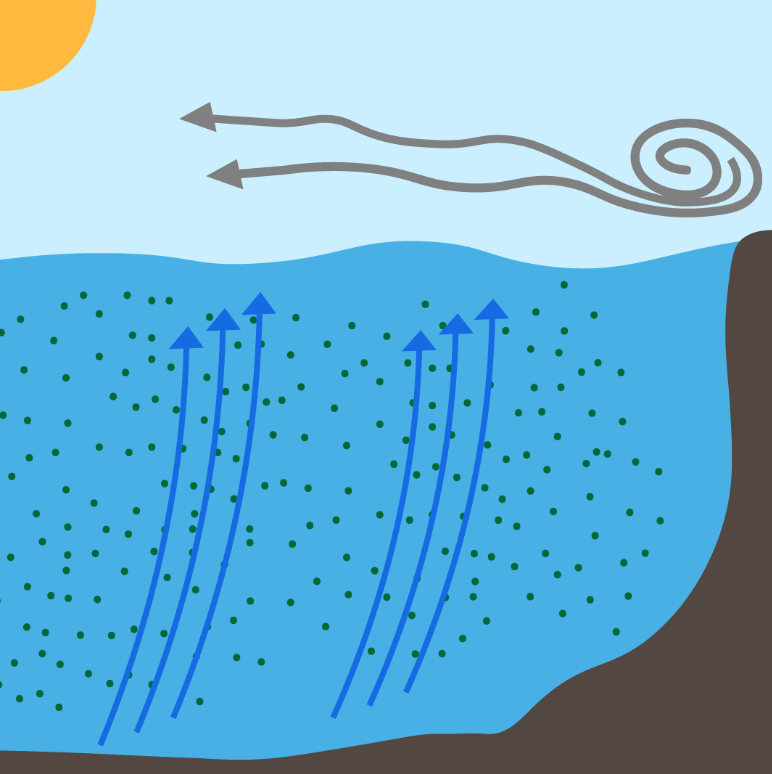 Upwelling brings COLD, nutrient-rich waters to the surface. Generally occurs along windy coastlines and underwater seamounts.