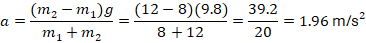 Two masses, 8 kg and 12 kg, are connected by a light rope over a frictionless pulley. Calculate the acceleration of the system and the tension in the rope.