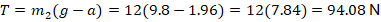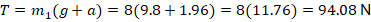 (Solution: F = m(g + a) = 60(9.8 + 3) = 60 × 12.8 = 768 N )