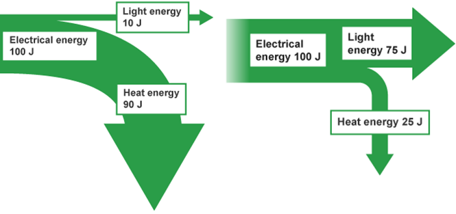 Distinguish between the energy efficiency of two light bulbs using the diagrams, and determine energy saved in joules over 250 bulbs.