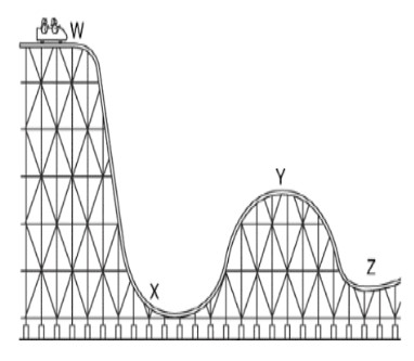 As the roller coaster car travels from Point W to Point X, what happens to its gravitational energy?