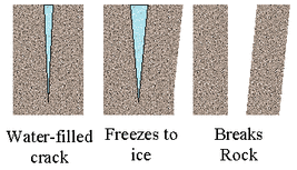 Mechanical weathering where water freezes and thaws, expanding and contracting in cracks