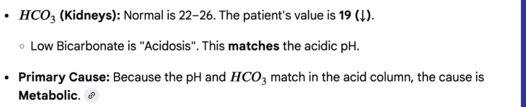 A patient in diabetic ketoacidosis (DKA) presents with a pH of 7.30, PaCO2 of 32, and HCO3 of 19. Calculate the imbalance.