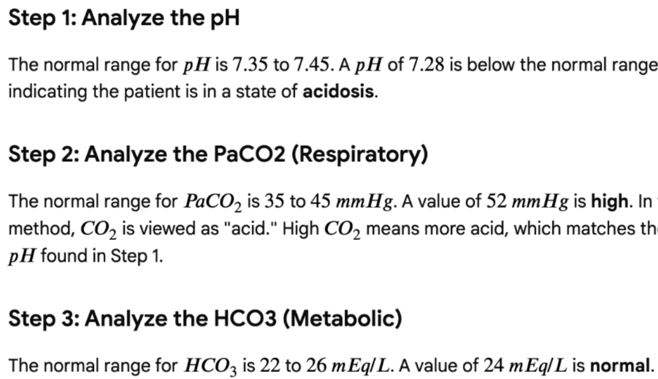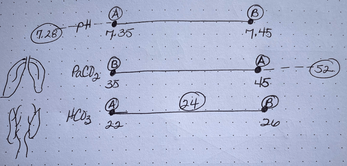A patient with chronic COPD has a pH of 7.28, PaCO2 of 52, and HCO3 of 24. Calculate the imbalance.