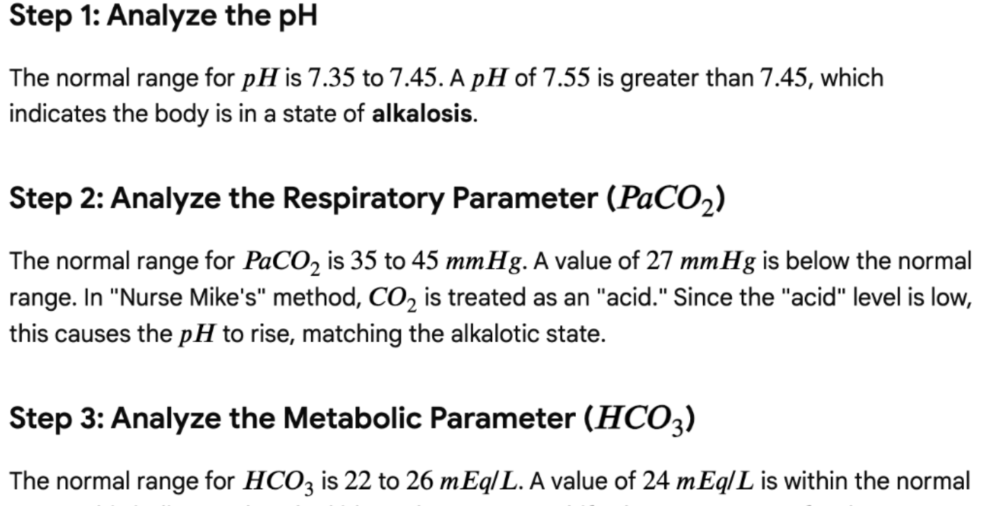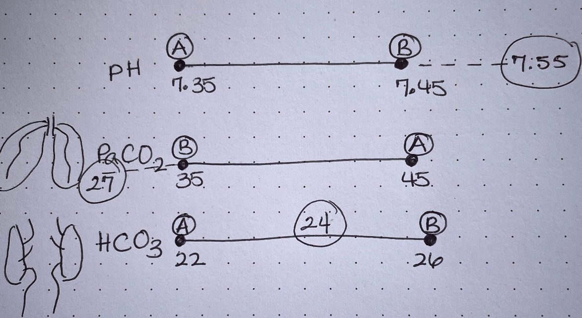 An anxious student hyperventilating before an exam has a pH of 7.55, PaCO2 of 27, and HCO3 of 24. Calculate the imbalance.