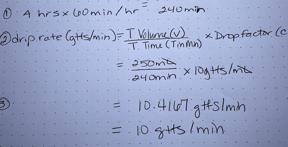 Calculate the gtts/min for 250 mL NS over 4 hours with a drop factor of 10.