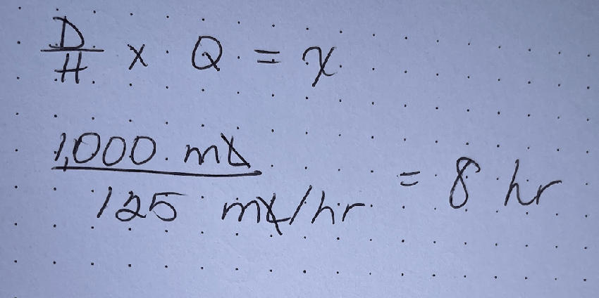A pump is set to 125 mL/hr. Total volume is 1,000 mL. Calculate how many hours it will run.