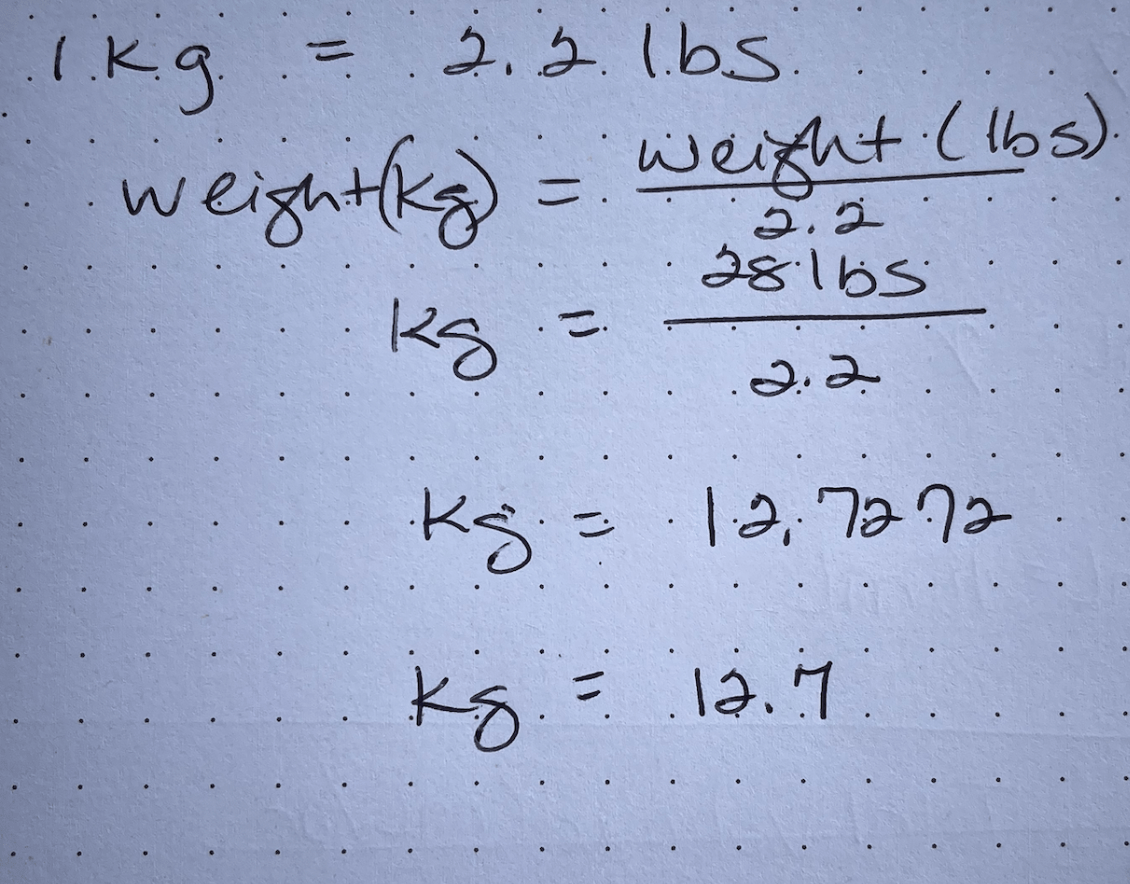 Convert 28 lbs into kilograms for a weight-based dose calculation.