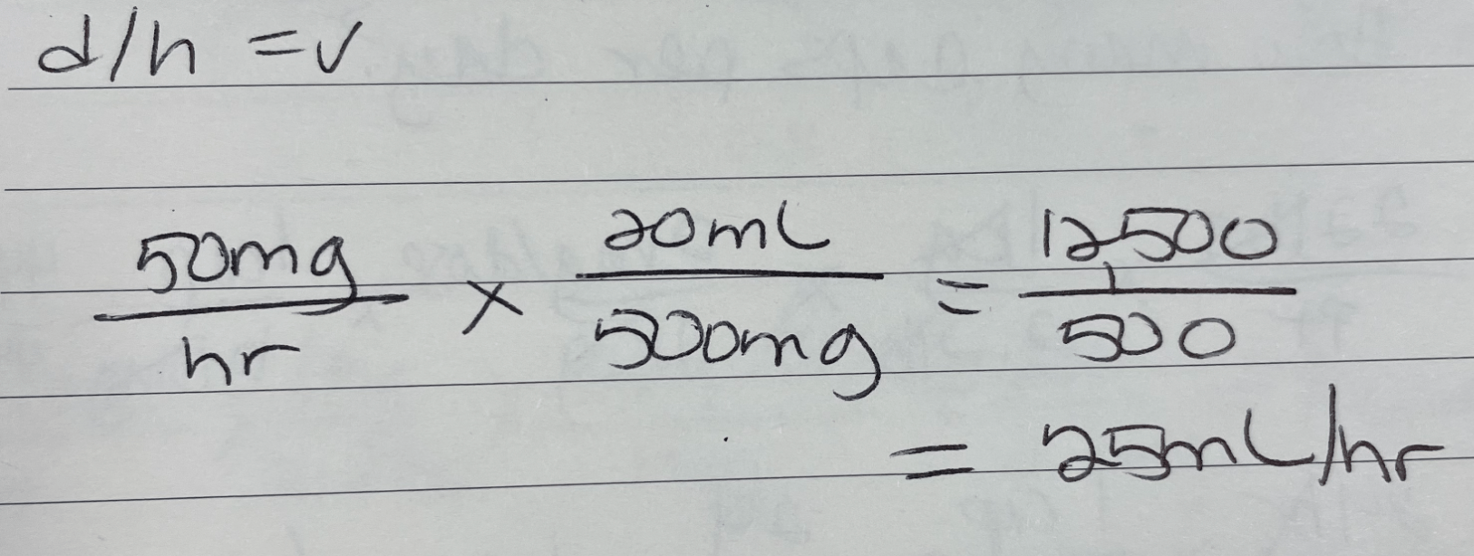 An IV bag contains 500 mg of a medication in 250 mL of D5W. The order is to infuse at a rate of 50 mg per hour. What is the flow rate in mL/hr?