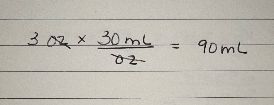 To convert 3 fluid ounces to the metric system, the nurse calculates this many milliliters (mL).