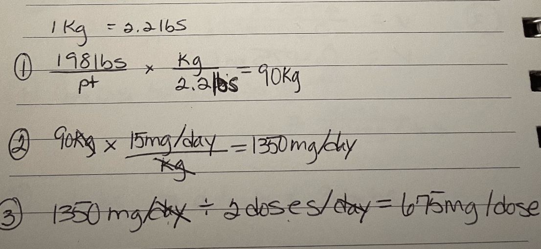 A patient weighing 198 lbs is ordered 15 mg/kg/day divided every 12 hours. This is the mg dose per administration.