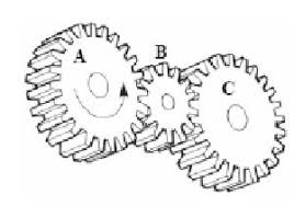 Gear A (driver) has 20 teeth, Gear B (idler, middle) has 40 teeth, Gear C (output) has 80 teeth.