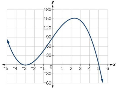 Write a polynomial equation for a graph that passes through the point (1, 56) and has three x-intercepts: (–3, 0), (2, 0), and (5, 0).