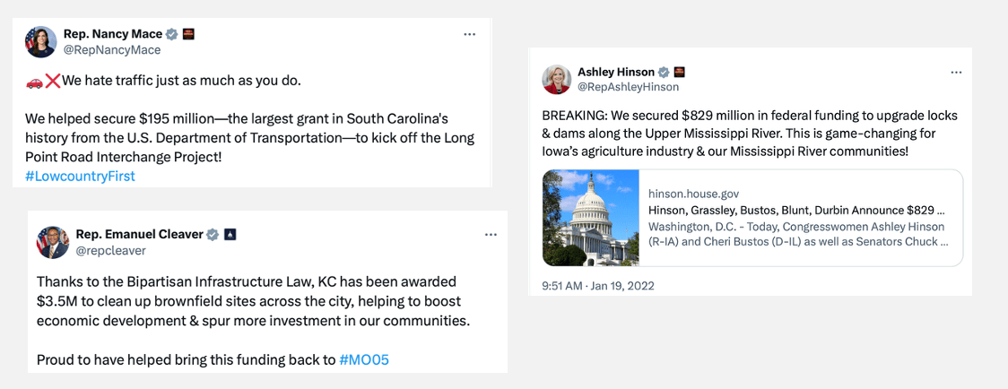 These tweets show members announcing local funding wins. What kind of congressional behavior is this and why do they do it?