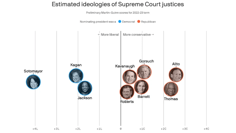 Based on this chart showing the ideological placement of Supreme Court justices, which justice represents the median voter, and why might that position give them extra influence over Court decisions?