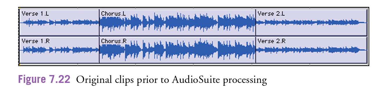 (Refer to the images below. The blue image showing the original clips prior to AudioSuite processing.)