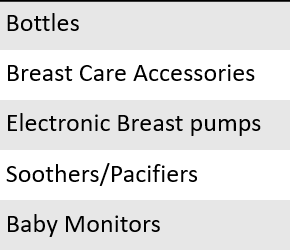 SCF: Feeding and non feeding products: e.g. bottles, breast pumps, pacifiers, sterilizers, niplettes, and warmers
