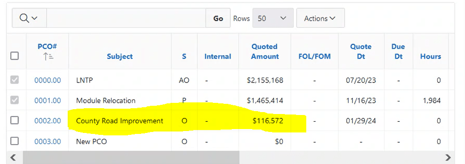 What is the PCO is in open status so it is not yet approved so the customer may not approve the full $166,572 amount
