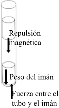 El peso del imán y la fuerza magnética que lo empuja del imán más bajo.