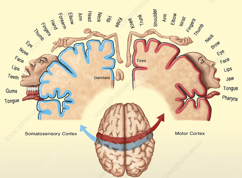 This metaphorical representation of the human body in the brain, depicts the relative proportions of the cortical areas dedicated to different body parts.