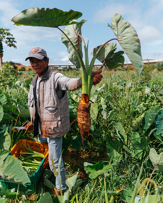 D. He is holding taro.