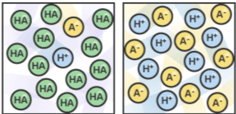 Which diagram (LEFT or RIGHT) represents a weak acid and how did you know?