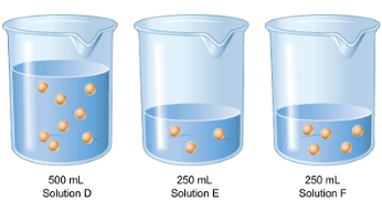 If each dot represents one mole of solute, what are the concentrations of Solutions D-F below?