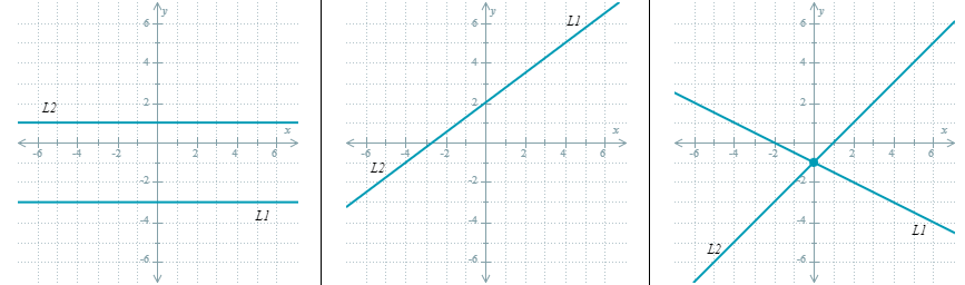Determine which graph shows one solution, no solutions, and infinitely many solutions: