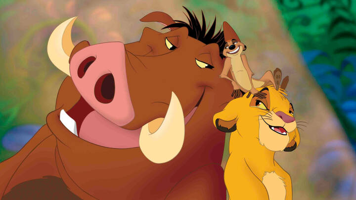 I Hvilken film er der en løve prins som bliver løftet af en abe ud over en kløft, og har to venner som spiser insekter?