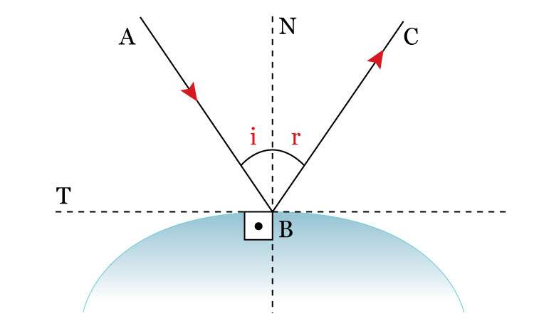 Observe a imagem abaixo. Se o ângulo entre o raio de incidência e a superfície é de 60°, qual o ângulo de reflexão?