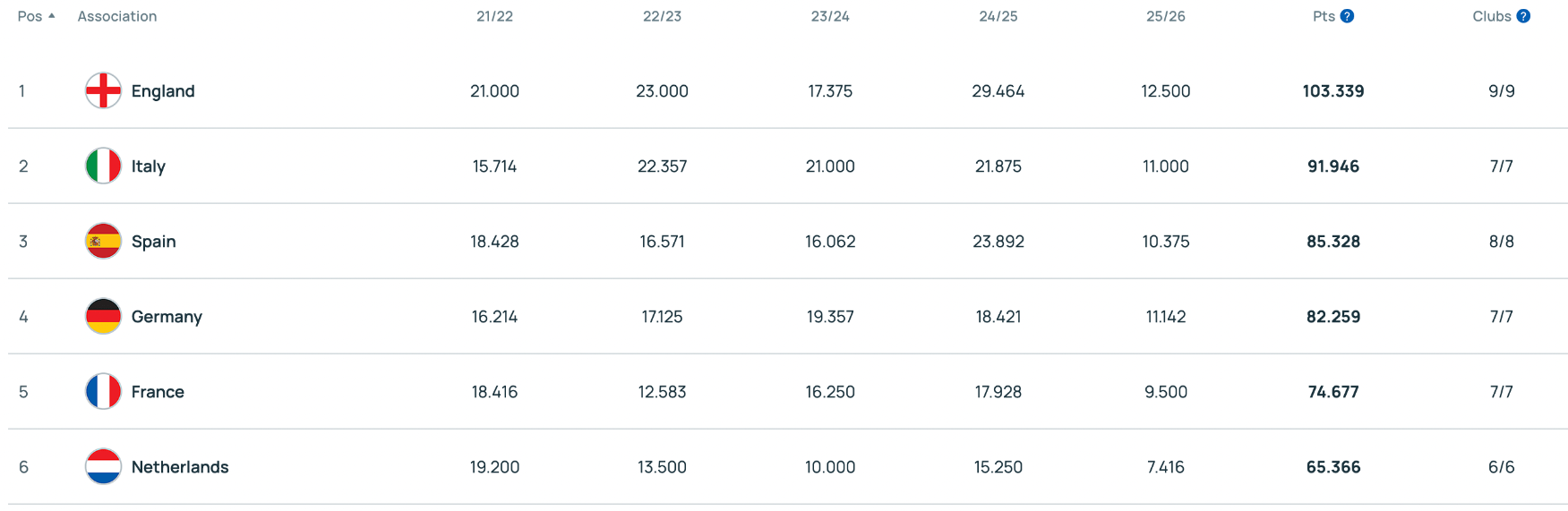 Nævn de seks største ligaer i verden ifølge UEFA (baseret på koefficientpoint). OBS: Angiv dem i korrekt rækkefølge!!