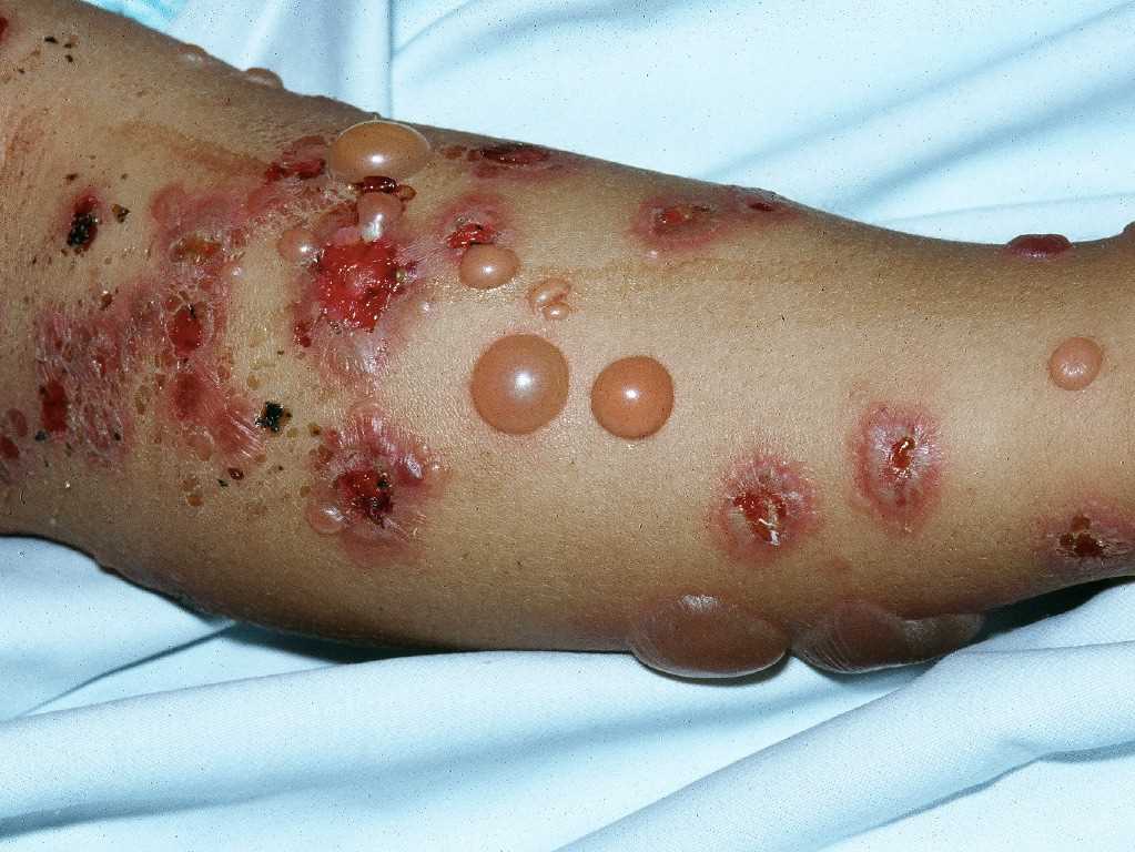 This eradicated viral infection, which presents with a distinctive rash that starts on the face and hands and spreads to the trunk, features deep pustules that scab over, leaving scars.