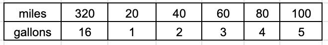 If you can drive 320 miles on 16 gallons of gas, make a chart for how many miles you can drive on 1, 2, 3, 4, and 5 gallons.