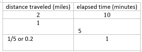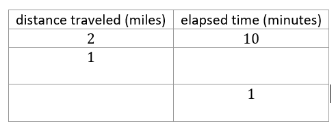Elena rode her bike 2 miles in 10 minutes. She rode at a constant speed. Complete the table to show the time it took her to travel different distances at this speed.
