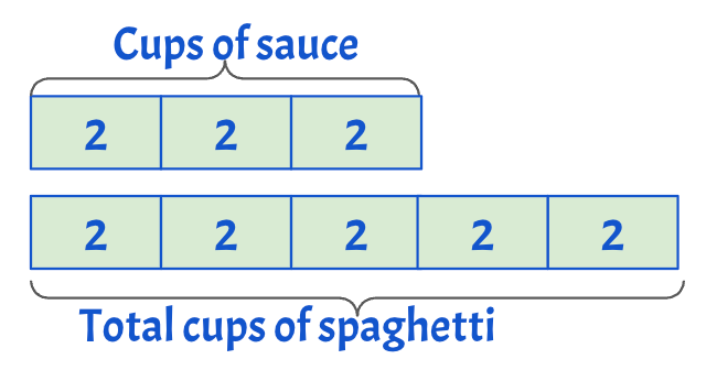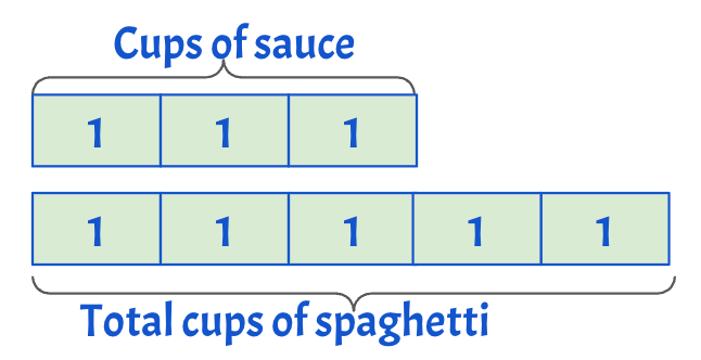 Look at the bar diagram. How many total cups of spaghetti would there be if there was 6 cups of sauce?