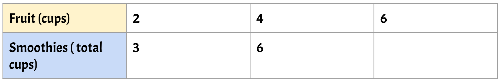Using the ratio table, how many smoothies would there be if there were 6 cups of fruit?