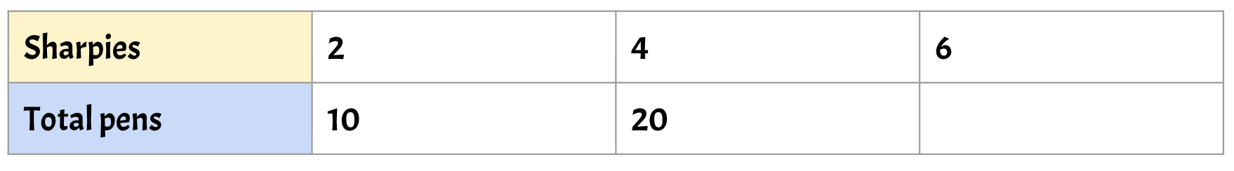 Using the ratio table, how many total pens would there be if there were 6 Sharpies?