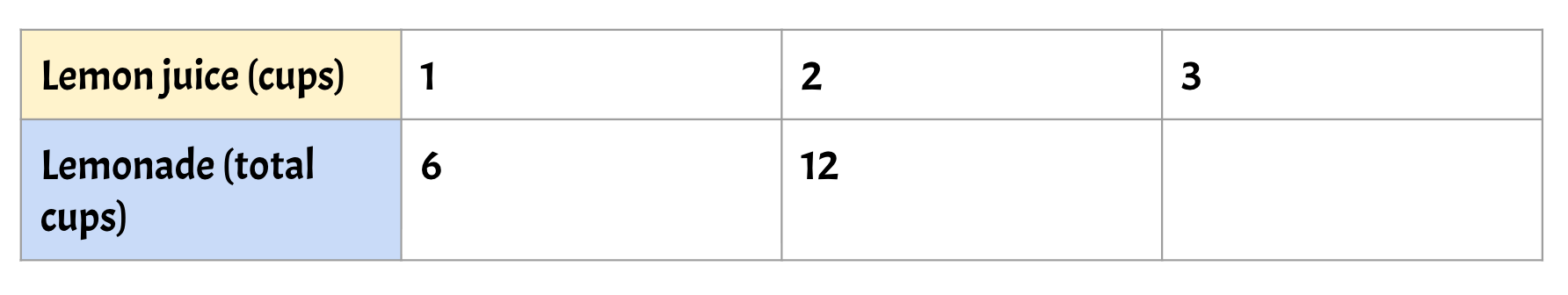 Using the ratio table below, how many total cups of lemonade would there be if you had 3 cups of lemon juice?