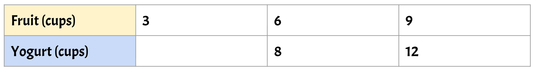 Look at the ratio table comparing cups of fruit to cups of yogurt. How many cups of yogurt would there be if there were 3 cups of fruit?