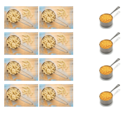 Abner se prepara macarrones con queso para el almuerzo. Su receta sirve para 4, pero solo quiere hacer 1 porción. Las recetas requieren 8 tazas de macarrones y 4 tazas de queso. ¿Cuánto de cada uno necesitará para sí mismo?