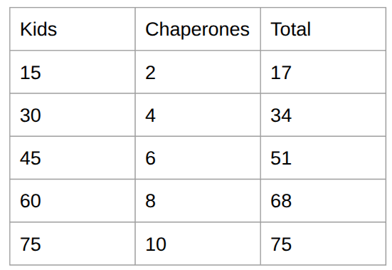 A teacher is planning a class trip to the aquarium. There are 2 chaperones for every 15 students. The teacher orders a total of 85 tickets. This is the number of tickets for chaperones and students.