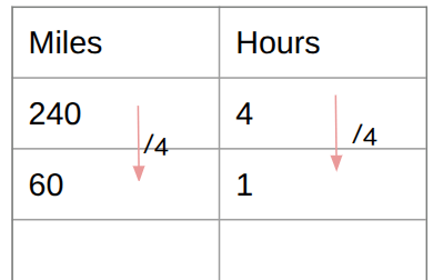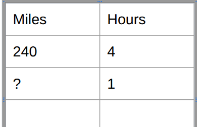 A car travels 240 miles in 4 hours. This is the car's speed in miles per hour.