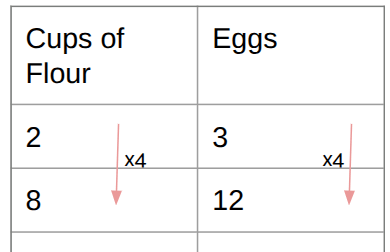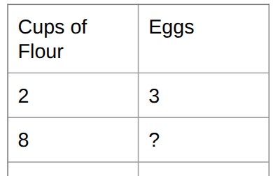 A recipe calls for 2 cups flour and 3 eggs. Using a table, this is how many eggs are needed for 8 cups of flour.